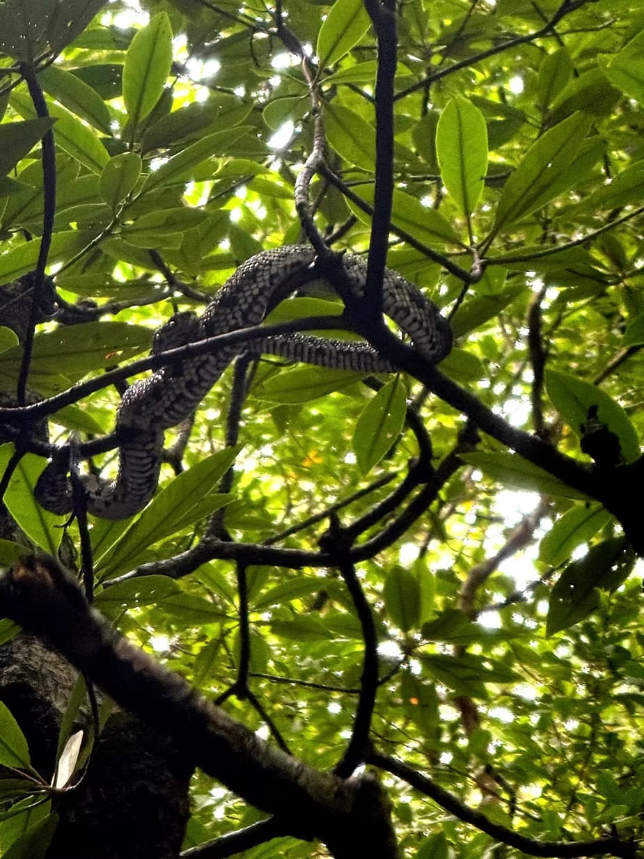 We voeren verder, op zoek naar slangen. Ja, je leest het goed. Giftige slangen. En we hebben er twee gevonden de ene hing gewoon in een boom boven ons hoofd. Als je gebeten wordt, heb je vier uur om een antigif te krijgen. Onze gids had het uitgerekend: wij hadden ongeveer 30 minuten speling. Dus: ogen open!